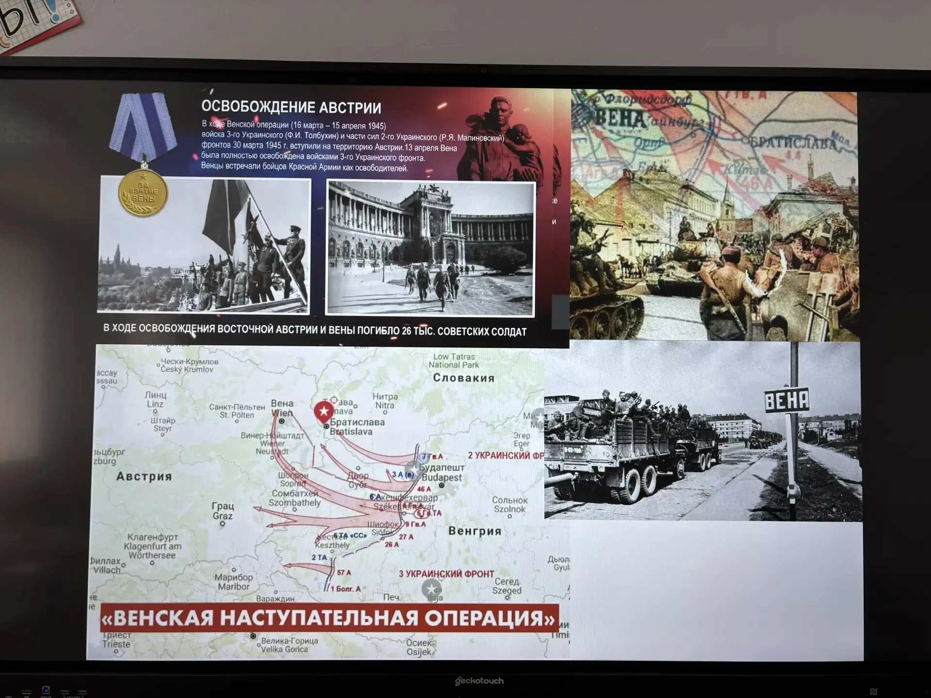 15 апреля 1945 года завершилась Венская операция Красной армии. К 80-летию этого события Минобороны РФ опубликовало на своём сайте уникальные документы об освобождении Австрии, Венгрии и Чехословакии от нацистских захватчиков. В преддверии этой даты, в школе проведены патриотические мероприятия. На уроках истории и классных часах учащиеся узнали о Венской наступательной операции, как стратегической наступательной операции Красной Армии против немецких войск во время Великой Отечественной войны. Эта операция проводилась с 16 марта по 15 апреля 1945 года войсками советских 2-го и 3-го Украинских фронтов в западной части Венгрии и Восточной Австрии.